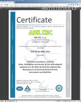 - Společnost ABE.TEC, s.r.o. je certifikována dle ISO 9001 na školicí činnost a poradenskou činnost v antistatice.